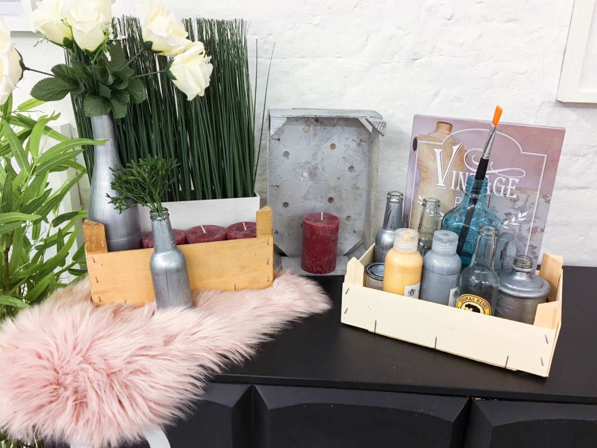 Streiche oder sprühe eine oder mehrere Kisten mit dem Acryllack ein und lasse diese gut trocknen. Danach benetze die Flaschen mit dem Sprühkleber, so hält der Acryllack besser auf der glatten Oberfläche des Glases. Ist der Kleber getrocknet, kannst Du die Flaschen mit der gewünschten Farbe kolorieren. Mit den Acrylstiften sind Dir jetzt keine Grenzen gesetzt was Muster oder Texte angeht. Der Sprühlack fixiert die Farbe auf den Flaschen, die Kisten benötigen in der Regel keinen extra Lack. Über Nacht trocknen lassen.
